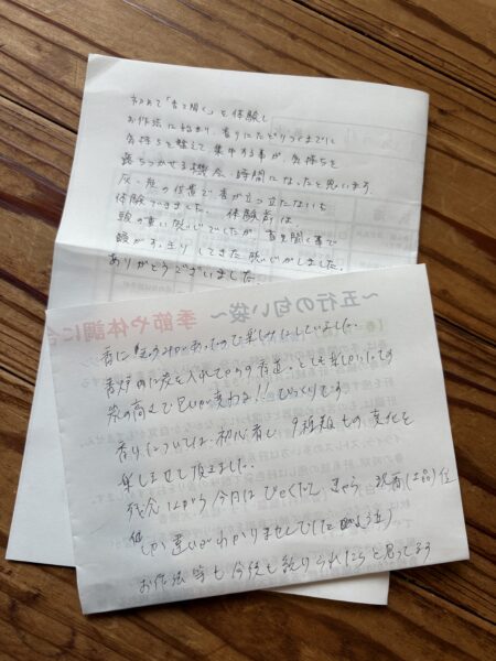 ●香木とは何かを知らなかったので、入り口の部分をもう少し教えていただいてから香りを聞いてみたかったです。後日資料をゆっくり読んでみたいと思います。